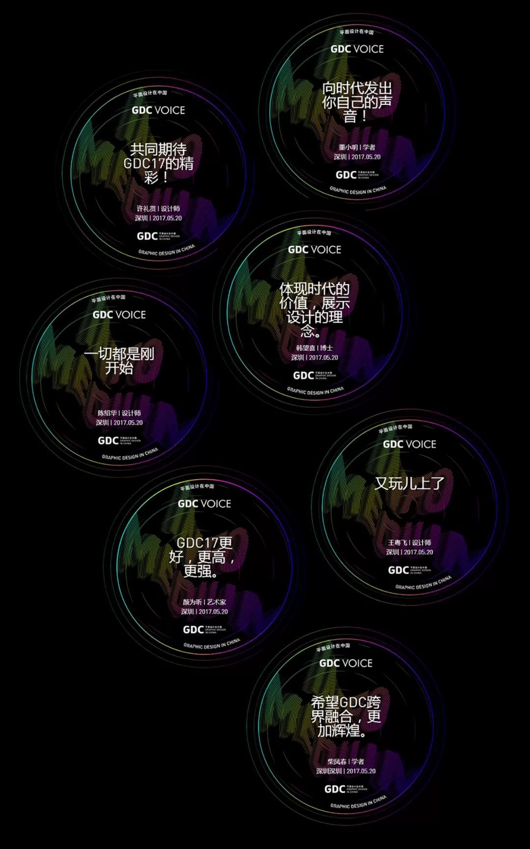 本届GDC核心策展理念为“发声”,视觉形象亦为“声音”这一符号的可视化呈现。四个关键词构成了本届活动的核心议题:视觉传达、时代主张、信息介质、多维视角,以“影响中国未来的设计”为宗旨,立意于对新时期平面设计价值声场的搭建。