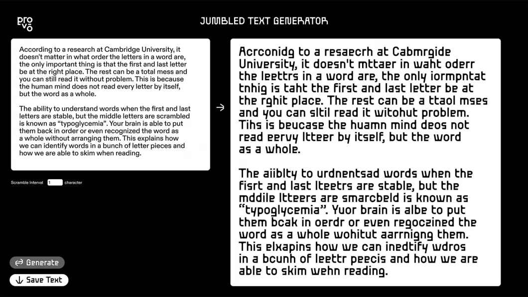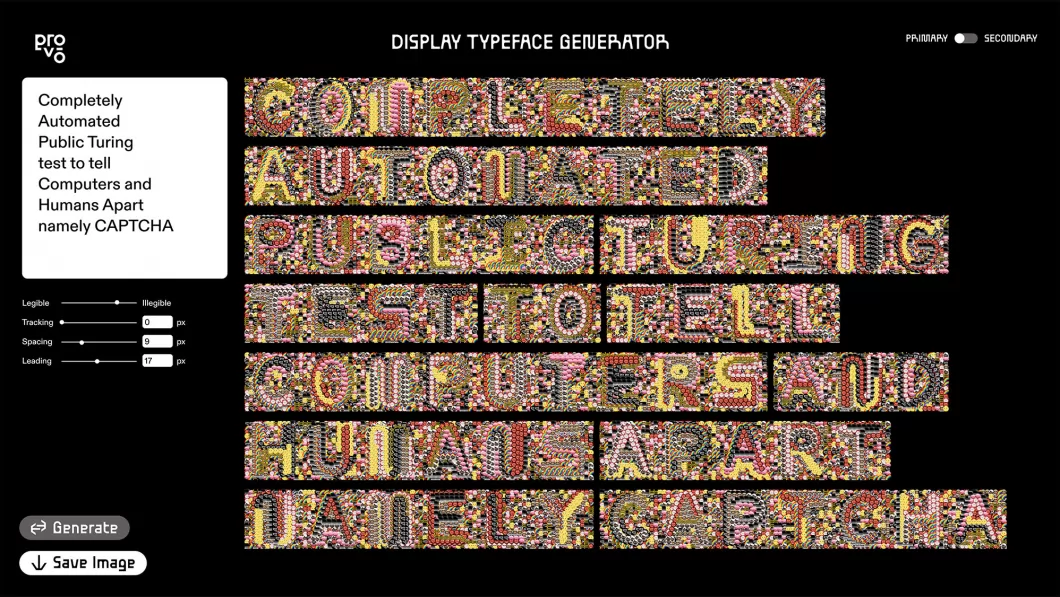 In a world where artificial intelligence evolves incessantly, distinguishing genuine AI becomes a growing challenge, and scams leveraging its capabilities are proliferating. The history of AI unfolds as a perpetual game of cat and mouse between human and machine. This dynamic and enduring struggle guarantees no everlasting solutions, yet it behooves us to at least sow a seed of perpetual vigilance. This project anchors itself in the divergence between human and machine reading methodologies. Inspired by CAPTCHAs, we generate a uniquely designed title font and create a text generator that, while jumbling word order, retains readability, demonstrating these two elements' application across various scales. The work is part of the "Provo" project.