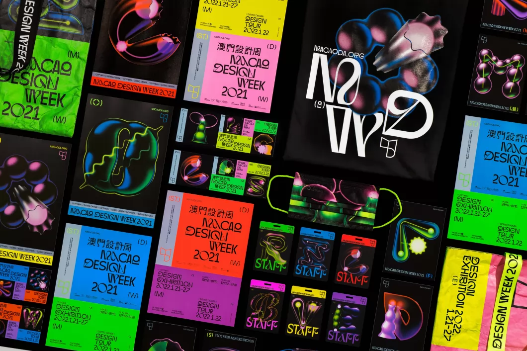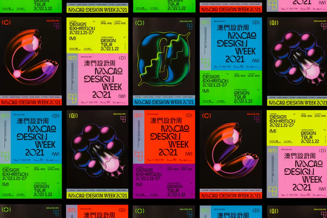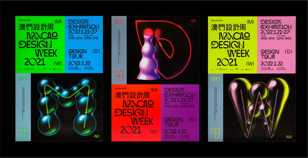 澳门设计周2021展览聚焦展出了本地和国外优秀的商业设计作品,带领观众从不同角度多元认识设计是如何可视化和体现商业品牌的文化与故事。主视觉设计灵感来源于澳门的“夜”与“光”。 从前的澳门仅仅是个小渔村,宁静的黑夜中只有屹立在东望洋山上的灯塔闪烁着光芒为过往的船只指引着方向。如今当你行走于这座以旅游博彩业为主要经济发展的城市,五光十色的霓虹灯在黑夜中不断变幻色彩。如同近年本地蓬勃发展的澳门设计在不断的绽放着各种各样的光芒,各行各业在设计的视觉传达下亦在迸发着属于自己的能量。同时希望贴合澳门的社会与文化背景,向观众传达一种澳门独特的文化混合、迷乱又时尚的视觉氛围。所以我们创作了26个英文字母以不同型态、结构、颜色在黑夜中发散光芒,它们不被具象的定义,因为它们不仅仅可以代表着澳门设计力量的每一位,亦可以是澳门的各行各业,甚至是每一个人都拥有属于自己独特且耀眼的光,打破常规以表达澳门当下的设计力量,借以传达设计从生活而来亦融于生活,同时展现澳门设计未来潜在着无穷的爆发力。