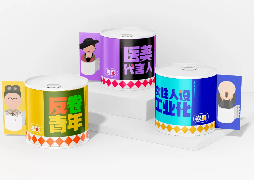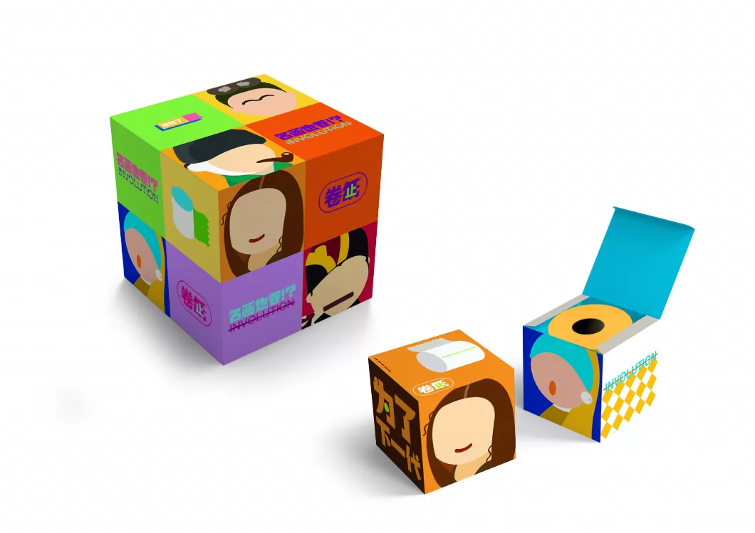 该作品是以近 几年火热的“内卷”现象为研究对象, 剖析内卷会导致的预期定律、躺平定律与逃逸定律,都在我们日常的生活中已经慢慢的浮现出来了。“卷止造物所”是采用设计的手法, 以日常生活中的卷纸作为设计载体, 搭建了一个虚拟的卷纸商店,强调“内卷”这一社会问题,呼吁大众进一步的给予关注。以内卷三大定律、 标志性事件及网络热词做为依据,提炼出文字词条,并嫁接到名画人物中以插画的形式呈现视觉符号,延伸出概念产品—“名画卷”,用“最卷的纸”来映射该“卷止”了的设计主旨, 希望透过设计引发观者的思考。