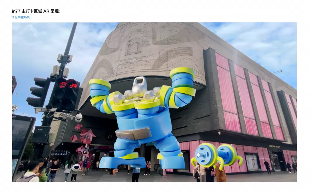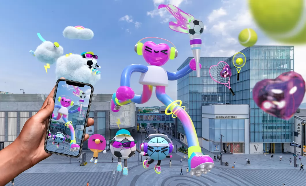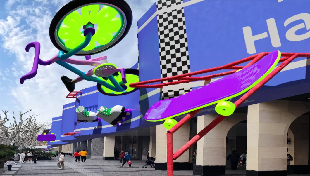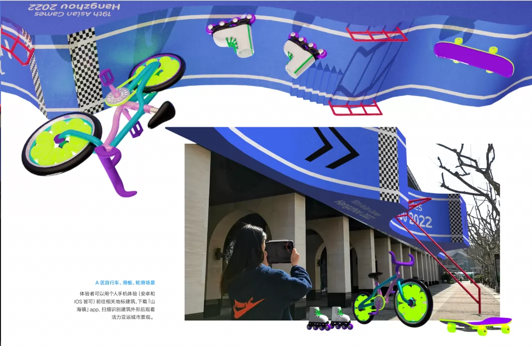 项目运营地点不仅有代表杭州江南人文的断桥,还有来福士,大金球等现代建筑,并以杭州最繁华、人流量最大的in77街区为主要体验区,分布有网球、举重、赛跑、自行车与足球AR景观。AR景观使用夸张、拟人、超现实等手法使运动元素与建筑紧密结合,以鲜艳的颜色与充满活力的动态使观看者感受到杭州城充斥着欢乐、激情、活力、相聚的亚运气息。