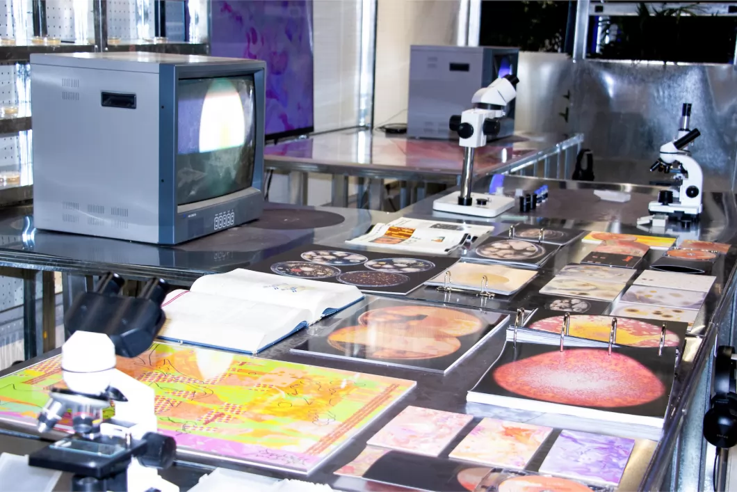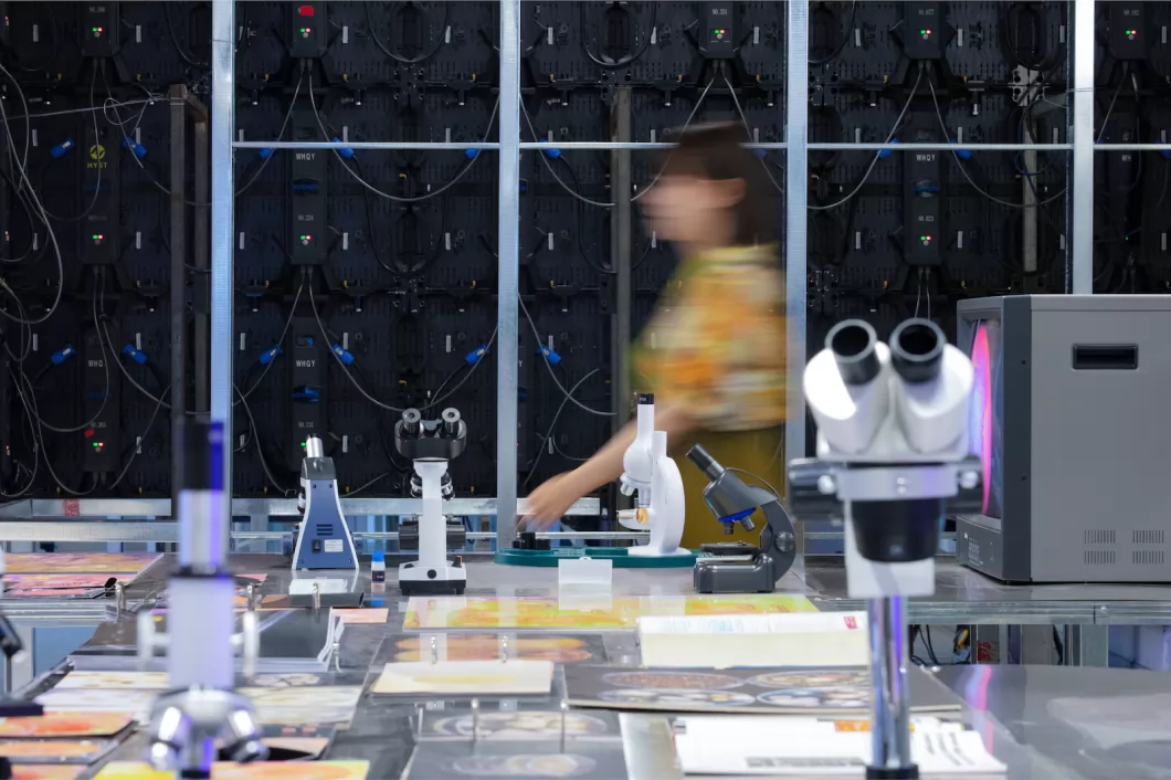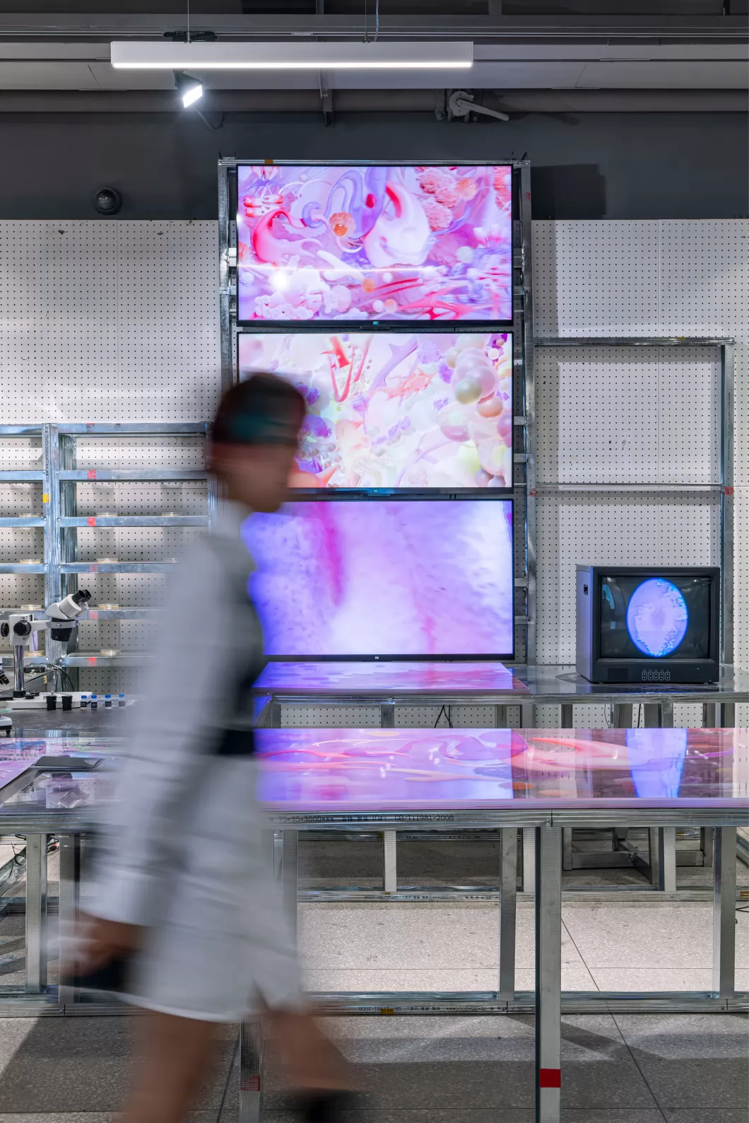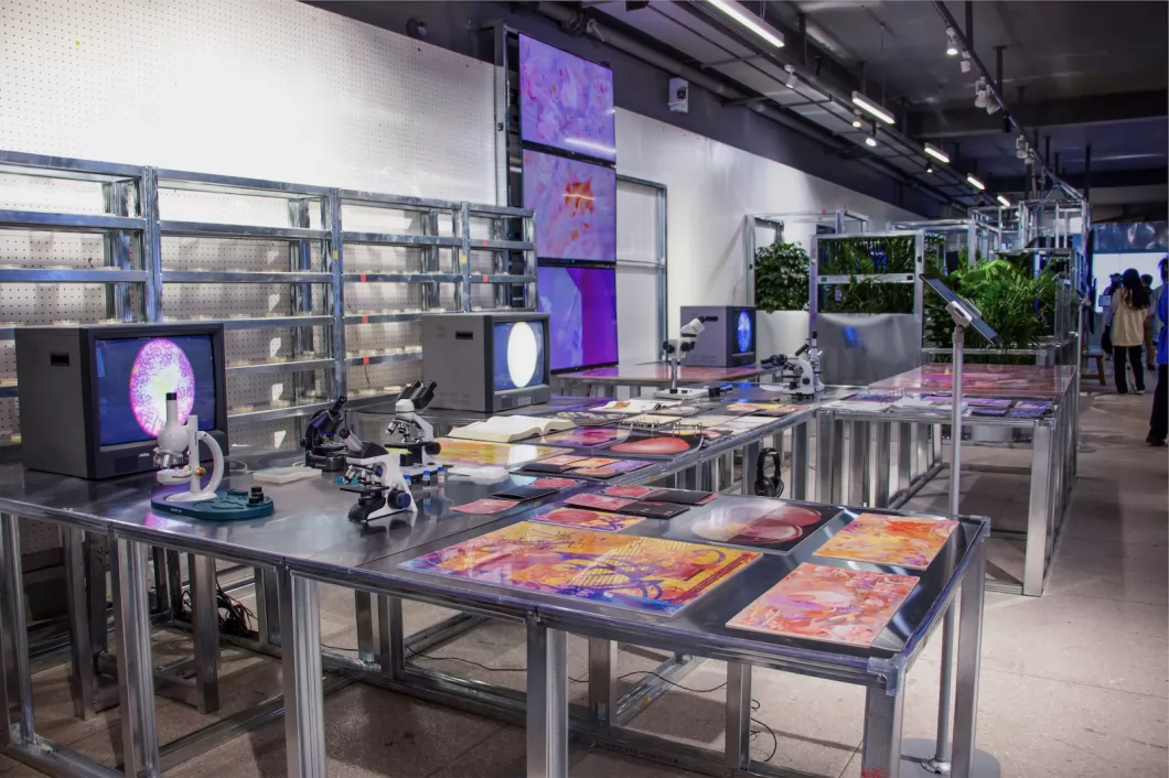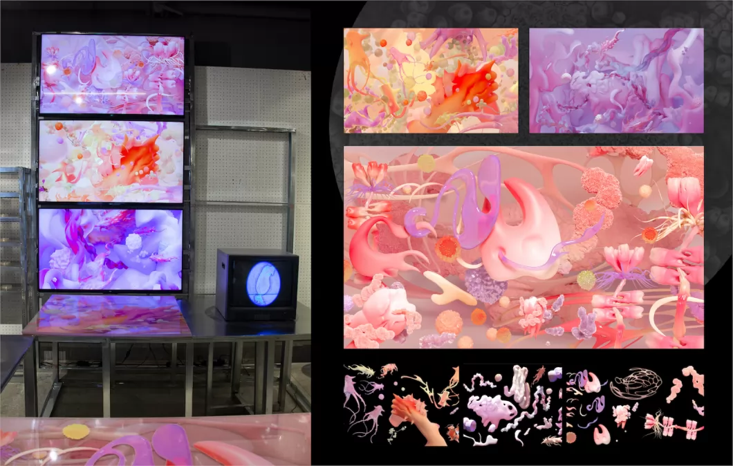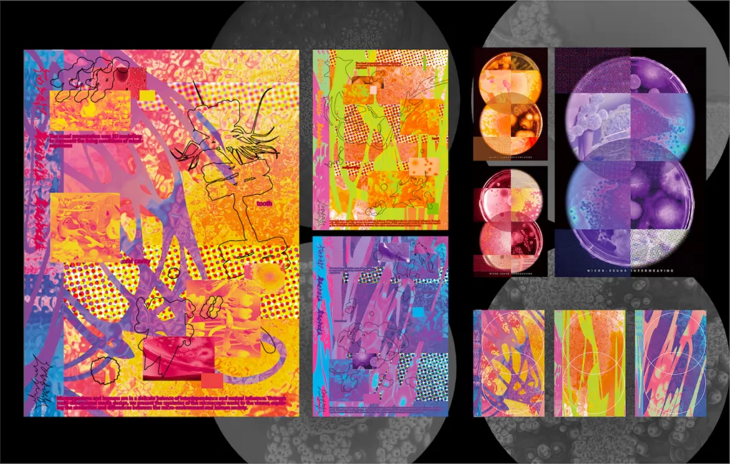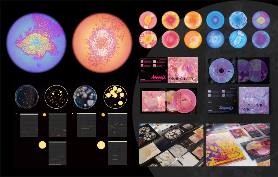 微生物和人类处于彼此依赖互相影响的微妙平衡之中。作品以微生物社群中的三种状态(交流、竞争、合作)为切入点,与人体的三个部位(口腔、手部、肠道)相结合,以3D动画传达微生物生活状态及与人体的关联,动态影像模拟其生长的过程,用声音设计呈现微生物群体的运作状态和节奏,展现微观世界的运作法则。引导观者思考微生物社群与人类社会的相互作用,思考如何促进微环境和宏观环境协调发展,积极探索微生物与人类和谐共存之道。