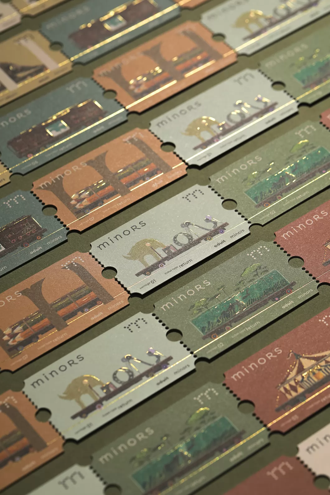 車票上的圖案都是充滿想像與童趣的場景,將車票撕下派出,任憑朋友、客戶隨心選擇,希望籍此讓我們於席間卸下裝作嚴肅的面孔,重投兒時最純粹和真誠的心境。