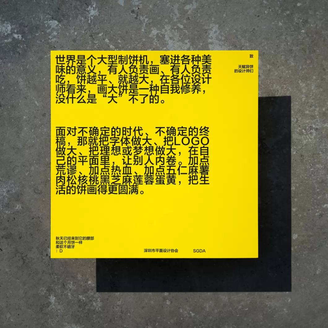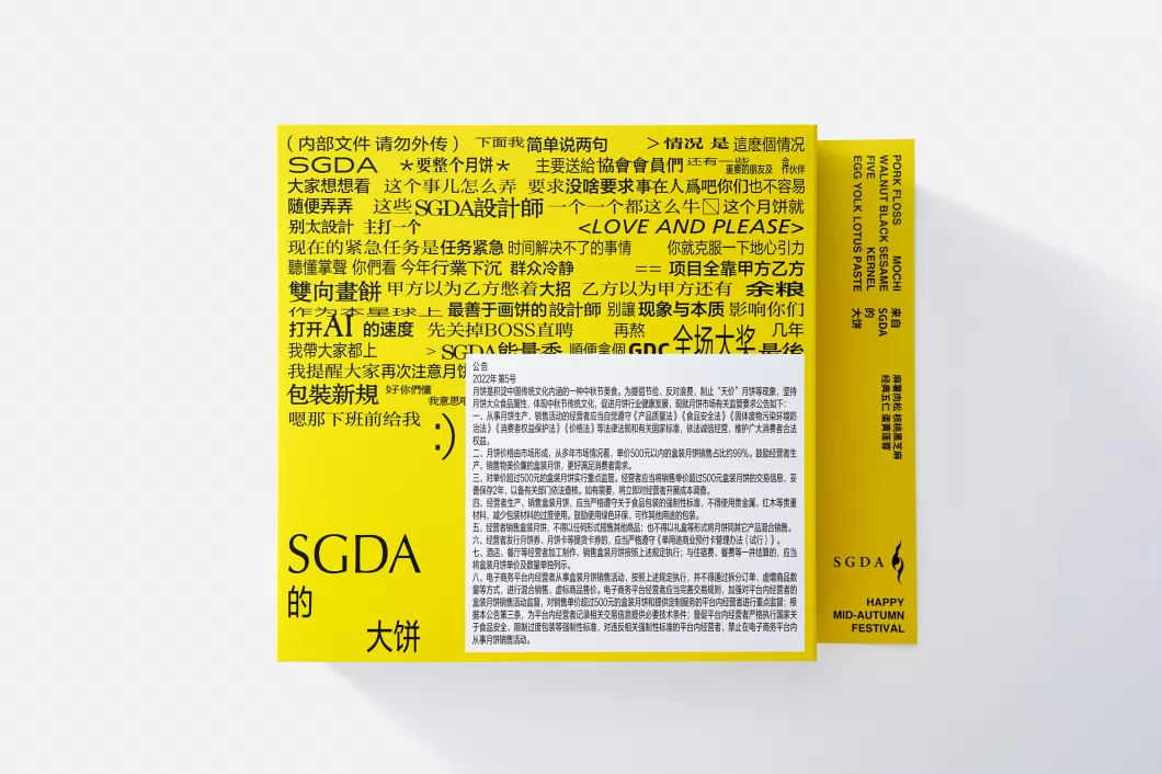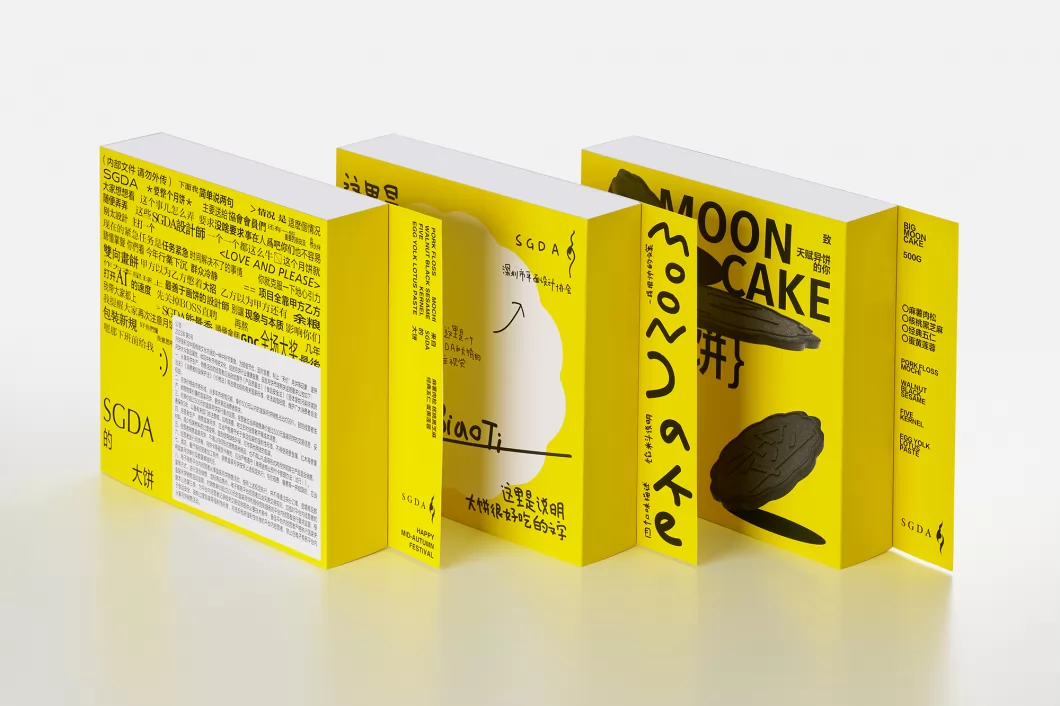 深圳市平面设计协会(SGDA,简称“深平协”)定制设计的中秋月饼礼,回归本质的包装结构,结合颠覆式的创意表达,围绕“画大饼”本意与延伸寓意,从设计呈现到大月饼本身,层层扣题。包装外封套共三款画面,呼应设计行业的工作日常:前期讨论、手绘草图、设计定稿,充分使用设计圈的日常黑话,以轻松幽默的方式,引发设计师们的深刻共情。