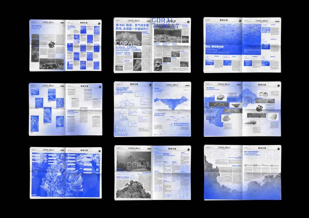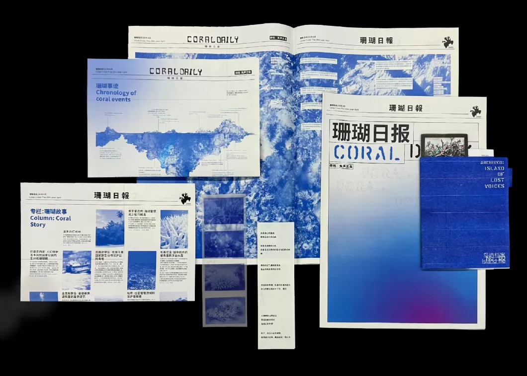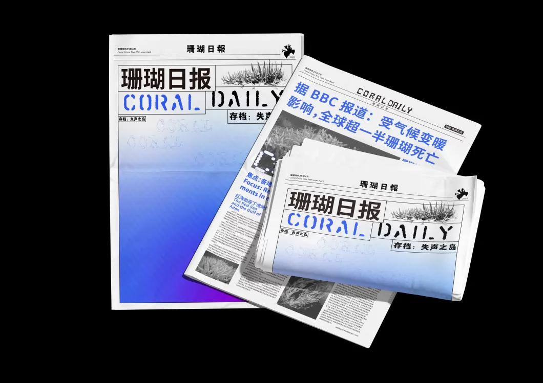 作品以珊瑚白化为核心,以珊瑚的嬗变揭示环境问题对于海洋生态的巨大威胁。我们将珊瑚礁珊瑚群落定义为海底的岛屿,以报纸为载体,搭建一个存储岛屿生平的档案,记录珊瑚群落的危机时刻,唤醒人们对于海底生物及海洋生态的关注与思索。