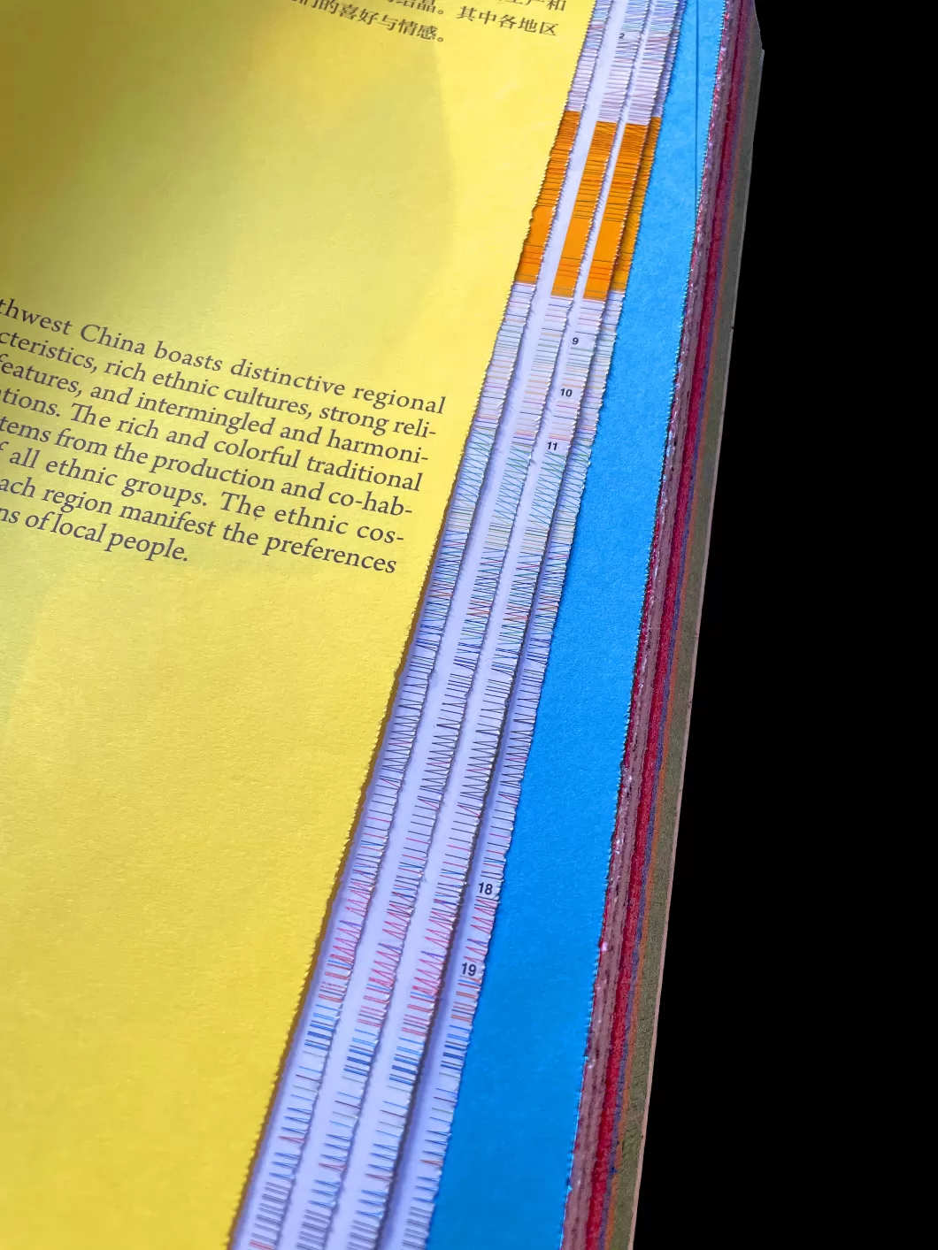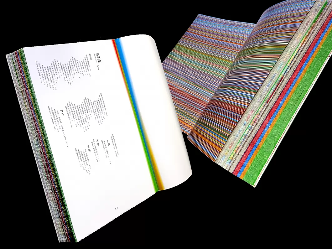 左翻部分呈现纸上观展的概念,以织和缝为编排的概念,让文字呈现出织布的画面感和缝纫的制衣过程。多种质感、色彩的纸张组合,表达展览丰富多彩的内容,多个地域呈现出民族服饰的华丽与多样,技艺繁多。5种颜色区分不同的地域,方便检索。