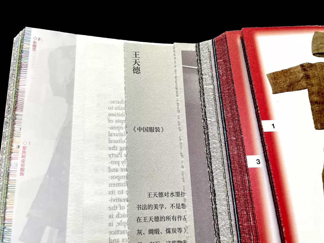 一本关于非遗服饰历史记忆的画册,左、右翻阅的方式阅读,呈现了展览相关活动、讲座、艺术创作、采访、传统服饰技艺等内容,展现了中国传统服饰技艺的现状和思考。