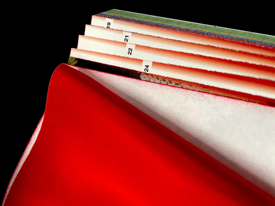 左翻与右翻的连接处使用了有色的复写纸,翻阅时与邻近的纸张摩擦,会留下色彩和触摸的痕迹。随着翻阅次数的累加,颜色和触痕会逐渐增多、加深,从而完成这本书的设计概念“服饰连接着过去与未来”。