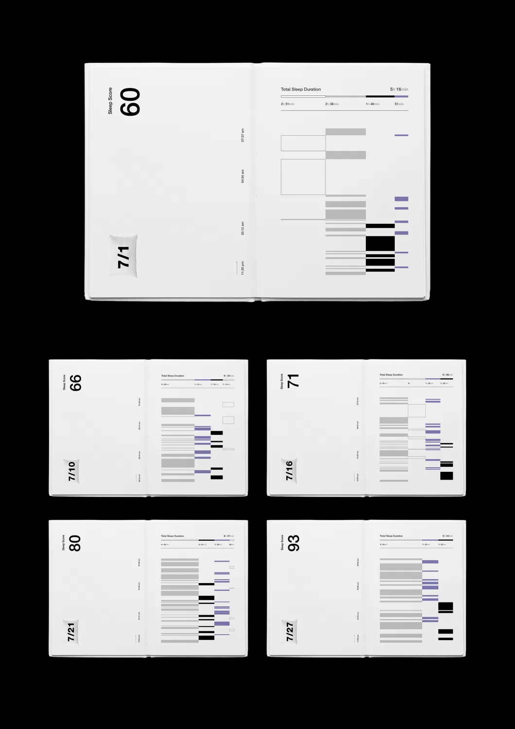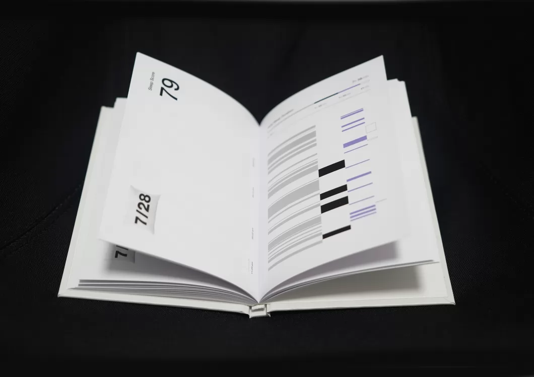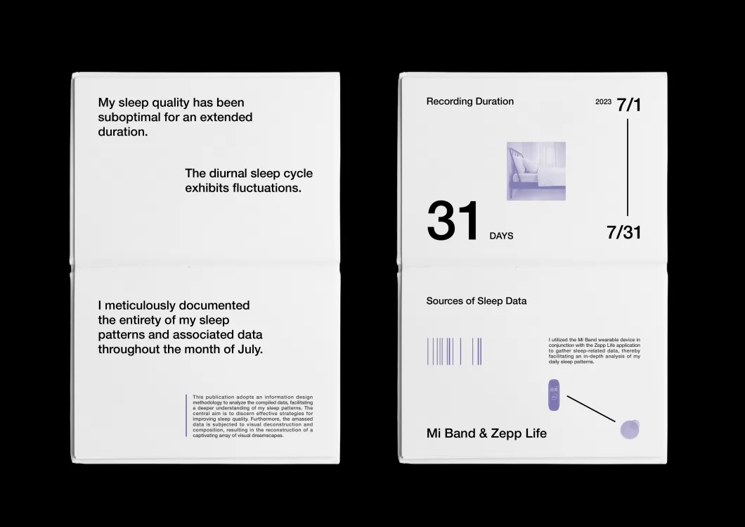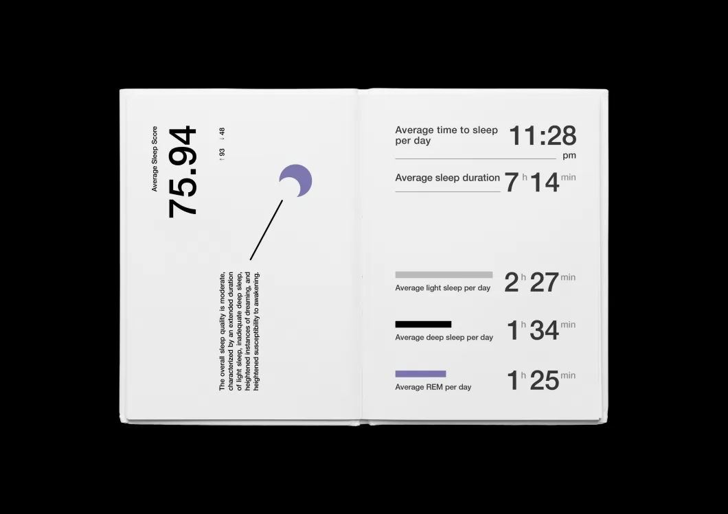 这是一本使用信息设计记录了作者一个月睡眠数据的出版物,以此帮助作者更全面地了解其睡眠质量,为提高睡眠质量提供有效的数据支持。同时在第二部分,作者对搜集到的数据进行视觉解构和重组,重构出一组有趣的视觉梦境图形实验作品。